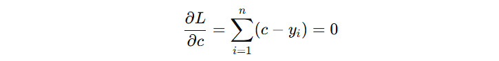 对于初始模型来讲,看看 c 输出什么时,损失函数最小。我们对 c 求导,设导数为 0: