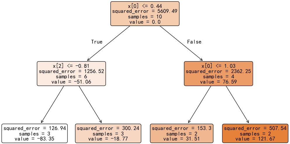 from sklearn.ensemble import GradientBoostingRegressor from sklearn.datasets import make_regression import matplotlib.pyplot as plt from sklearn.tree import plot_tree import numpy as np def demo(): np.random.seed(0) x, y = make_regression(n_samples=10, n_features=3, random_state=42) gbdt = GradientBoostingRegressor(n_estimators=3, max_depth=2, criterion='squared_error', loss='squared_error') gbdt.fit(x, y) # 可视化 # for estimator in gbdt.estimators_: # plt.figure(figsize=(10, 10)) # plot_tree(estimator[0], filled=True, rounded=True, fontsize=14, precision=2) # plt.show() # 新数据预测 new_x, new_y = make_regression(n_samples=1, n_features=3, random_state=42) print('输入数据:', new_x) print('模型计算:', gbdt.predict(new_x)[0]) # 手动计算 # 1. 计算初始输出值 total_score = -8.0900466155 # 2. 累加每个树输出值 learning_rate = 0.1 for estimator in gbdt.estimators_: # 每棵树计算得分 score = estimator[0].predict(new_x) # 累加每棵树得分 total_score += score[0] * learning_rate # 3. 最终输出值 print('手动计算:', total_score) if __name__ == '__main__': demo()