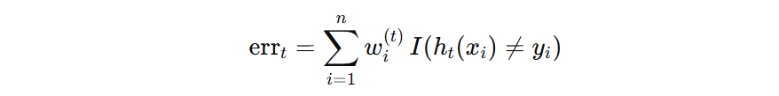 为了得到模型的错误率,需要判断每个样本的预测结果是否正确,然后基于下面的公式计算模型的错误率。错误样本共 3 个,其权重和为 0.1+0.1+0.1=0.3,所以该模型的错误率为:0.3。