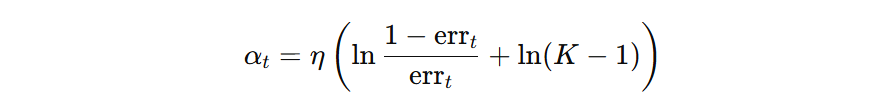 - 当弱学习器的错误率高于随机猜测 \(1-1/K\) 时,模型的权重是负值,那么样本的权重在更新时,分类错误样本权重会降低,分类正确的样本权重会上升,这使得继续训练会产生更大的错误,所以停止训练。