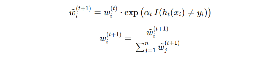 如果之前对该样本预测错误,则提高样本权重,否则权重不变。然后重新归一化,得到第二轮迭代需要的样本权重。