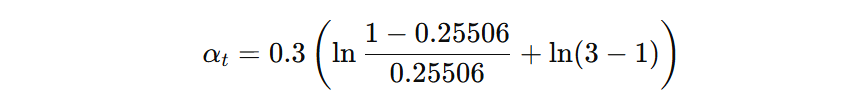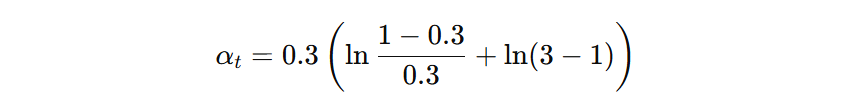 模型的权重根据下面公式计算即可(\( \eta=0.3、K=3、err_{t}=0.3 \)):