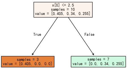 我们基于这些带权重的样本训练第一个弱决策树,核心是找一个切分点,将样本分为两类。针对当前样本权重,训练得到的最优切分点为:X≤4.5 的样本为一组,X>4.5 的为另一组,如下图所示: