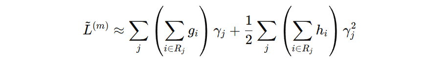 每个样本的输出值对应某个叶子节点的值,所以我们可以以叶子节点为单位计算每个样本的输出值、一阶导、二阶导,那么得到如下公式: