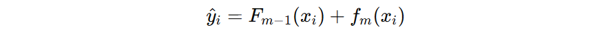 公式表示,模型的预测结果 \( \hat{y} \) 等于 \( m-1 \) 树的输出结果 + 当前树 \(f_{m}\)的输出结果。