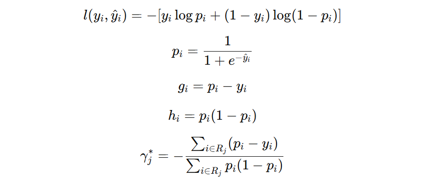 假设我们使用 log loss、square loss 损失函数,那么叶子节点的输出值公式为: