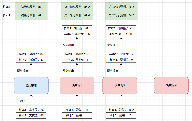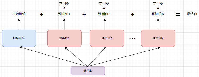 预测的过程是,初始策略(先验预测,训练后确定的固定常数)给出初始预测,再由多棵决策树逐步修正预测预测(后验预测,负责逐步修正),最终是将初始预测和不同弱学习器的输出相加。注意:每个弱决策树的输出还需要乘以一个系数,该系数叫做学习率。