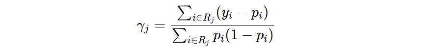 决策树叶子节点输出值默认为该节点上样本目标值的均值。但实际上,叶子节点最终输出值需要根据损失函数进行修正。对于 log loss,叶子节点输出值的修正公式如下: