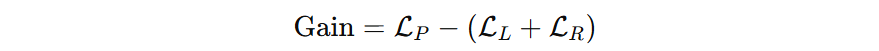 那么,我们可以通过衡量分裂前后的损失下降幅度来构建一个新的分裂增益计算方法(既考虑训练损失,也考虑树的复杂度带来的损失):