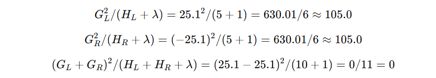 Gain = 0.5 ∗ (105.0 + 105.0 − 0)−0 = 0.5 ∗ 210.0 = 105.0