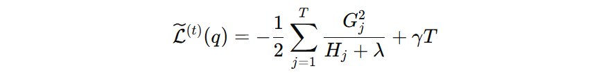 此时,将叶子节点输出值公式代回到原公式中,得到在最优输出的情况下,树的损失表示: